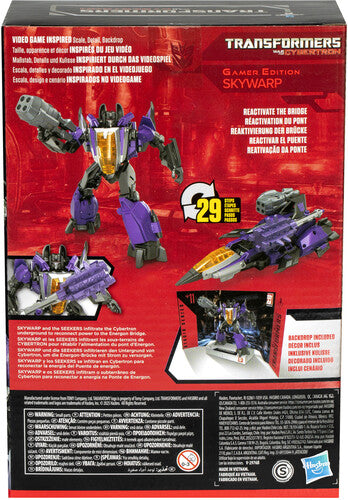 Transformers Studio Series Gamer Edition toys are collectible action figures that feature video game-inspired details and accessories. Convert the Studio Series Transformers action figure from robot to jet mode in 29 steps and pose the Skywarp toy in the included Reactivate the Bridge removable backdrop scene.